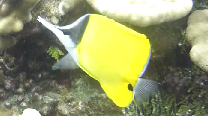 | アカマツカサ(25㎝)。ホントは赤い。 | シマアジの幼魚(30㎝)の群れは、人懐っこい。 | 黄色いヤガラ(40cm)は、ゆっくり動く。 | イースターアイランド・バタフライ(10㎝固有種)。 |
