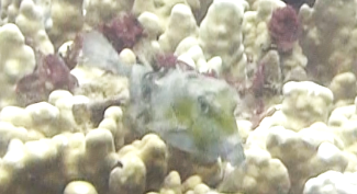 | 完全に目が合ったミゾレフグ(30㎝)。 | マナバイ・ケイブに入って行きます。 | ケイブの出口は真上。 | 水深5mにいたナメモンガラ(10㎝)。 |