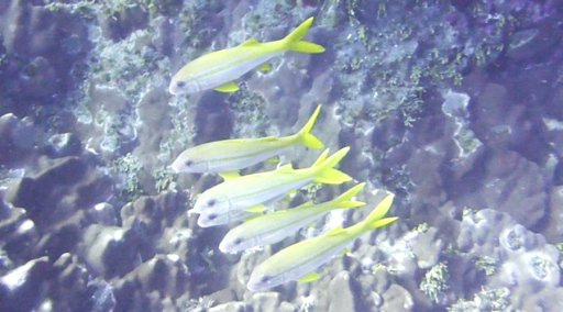 | 斑点のイスズミ(25㎝)。 | ウツボ(直径5cm)。 | 黄色いヤガラ(約40cm)。 | フエヤッコダイ(10㎝)。 |