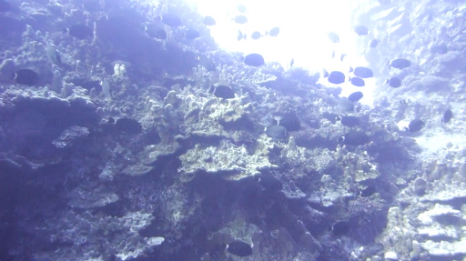 | サンゴが付いた水中モアイとフエヤッコダイ(10㎝)。 | ニザダイ(25㎝)。 | 錆びたアンカー。 | ヤガラ(40cm)。ホントは黄色い。 | イースターダムゼルフィッシュ(3㎝固有種)。ホントは鮮やかな青色。 |