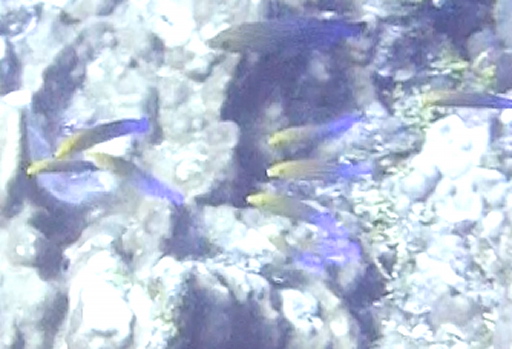 | イースターダムゼルフィッシュ(3㎝固有種)。 | クラゲ?(3㎝+α)。 | ホツマツア・ピグミーフィッシュ(4㎝固有種)。 | ニザダイ(25㎝)の滝登り?。 | アンカーラインで安全停止。 |