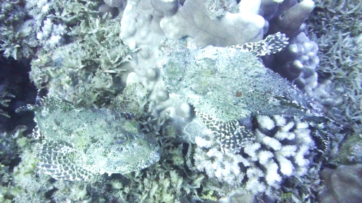 | 固有種のイースターアイランド・ゼムフィッシュ(4cm)。 | 水深30m。油断すると気づかないまま落ちてく。 | 水深20mのケイブ。 | カサゴ(20㎝)ホントは赤い。 | ヤガラ(30㎝)。 |