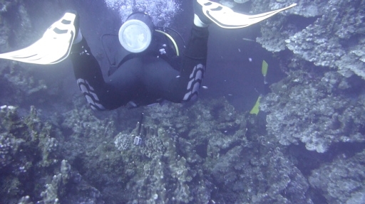 | 担当ガイドのルオさん。ゲスト5人に1ガイドの2グループに分かれてダイビング。 | ボートでポイントへ向かう途中で、停泊してるヨットからオーストリア人親子3人をピックアップ。 | 水深20m以上だけど、視界良好。 | オニハタダテダイ(15cm)。右奥にサメ。 | ヤッコ(? 20cm)。 |