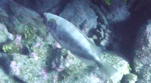 | イスズミ(30㎝)。 | ベラ(20㎝)。すぐ逃げる。 | ハコフグ(15cm)。少し近づいてきてくれた。 | アカヒメジ(25㎝)の魚群。近づいても逃げない。 |