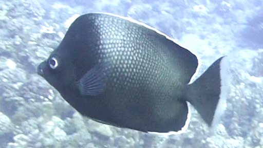 | イースター島固有種の青いイースターダムゼルフィッシュ(3㎝)。 | イースター島固有種の白黒のイースターアイランド・バタフライ(10㎝)。 | イスズミ(25cm)。焼いても煮てもおいしい。 | クリスチャンの後頭部を見ながら帰路に。 |