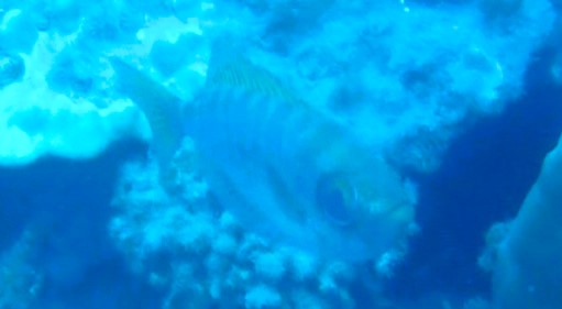 | イスズミ(30㎝)。 | ベラ(20㎝)。すぐ逃げる。 | ハコフグ(15cm)。少し近づいてきてくれた。 | アカヒメジ(25㎝)の魚群。近づいても逃げない。 |