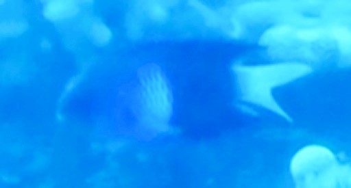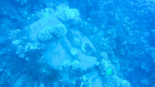 | サンゴが付いた水中モアイとフエヤッコダイ(10㎝)。 | ニザダイ(25㎝)。 | 錆びたアンカー。 | ヤガラ(40cm)。ホントは黄色い。 | イースターダムゼルフィッシュ(3㎝固有種)。ホントは鮮やかな青色。 |