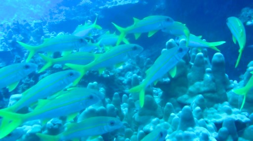 | 斑点のイスズミ(25㎝)。 | ウツボ(直径5cm)。 | 黄色いヤガラ(約40cm)。 | フエヤッコダイ(10㎝)。 |