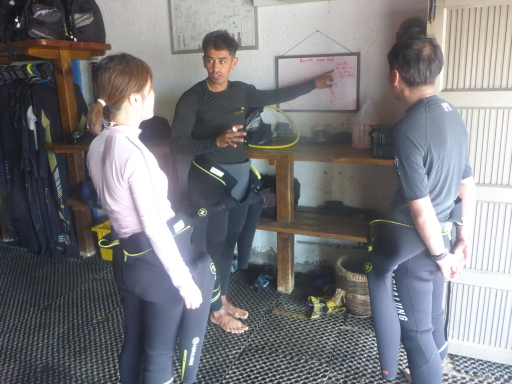 | 他のゲストと一緒にブリーフィング。 | ガイドのクリスチャンの背中越しにポイントの無人島。 | ウツボ(直径5cm)。 | イスズミ(25㎝)。 | ハリセンボン(10cm)。 |