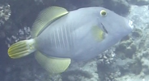 | モンガラ(15㎝)。 | 黄色のイスズミ(25㎝)が3匹。遠いね。イースター島名はナヌーエパラ。 | イースター島固有種のイースターダムゼルフィッシュ(3㎝)。 | ウツボ(直径5cm)。 | イースターアイランド・バタフライ(10㎝固有種)。 |