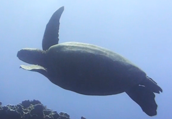 | ミゾレフグ(30㎝)。形も動きもゲームのキャラクター似。 | ウミガメ(70㎝)。少し近づかせてもらえました。 |
